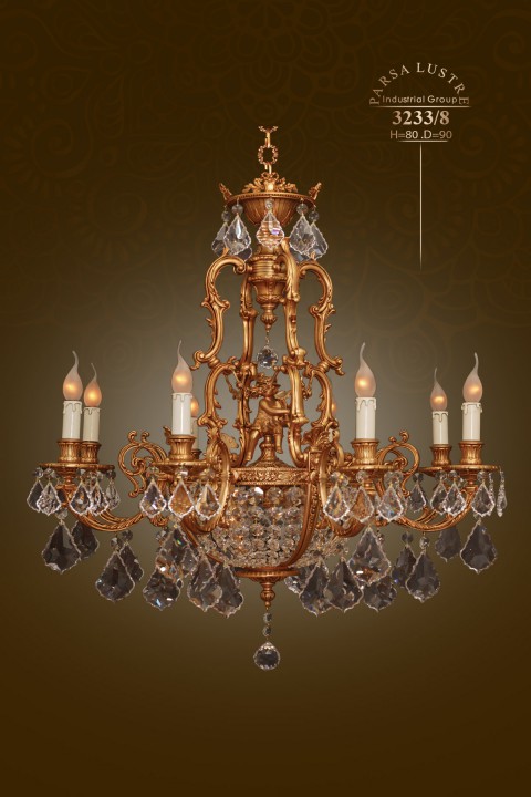 Đèn chùm 3233/8 có 8 bóng đèn. Kết hợp tinh tế với Pha lê hãng ASFOUR (Ai Cập) Chất liệu: Đồng được mạ vàng 9999 Thụy Sĩ. Chiều cao:80 cm (chưa bao gồm móc xích) Chiều rộng: 90 cm Khối lượng tịnh: Kg Xuất xứ: Iran Hàng mới 100%