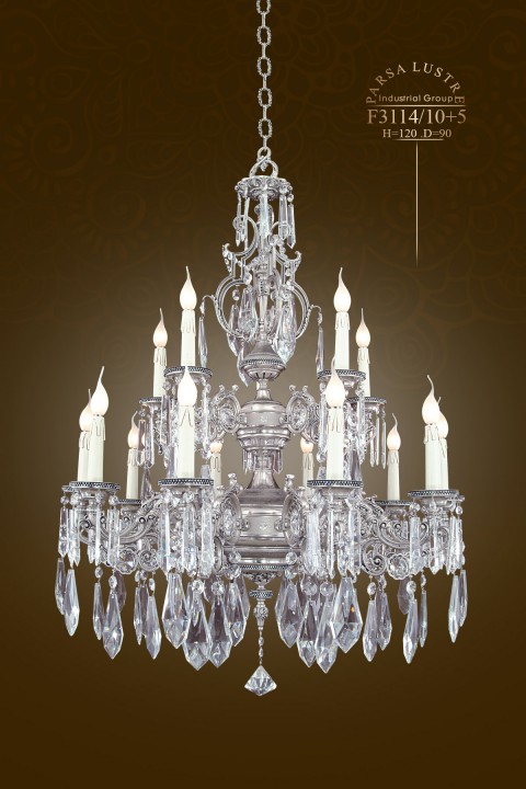 Đèn chùm F3114/10+5 có 15 bóng đèn được chia thành 2 tầng. Kết hợp tinh tế với Pha lê hãng ASFOUR (Ai Cập)