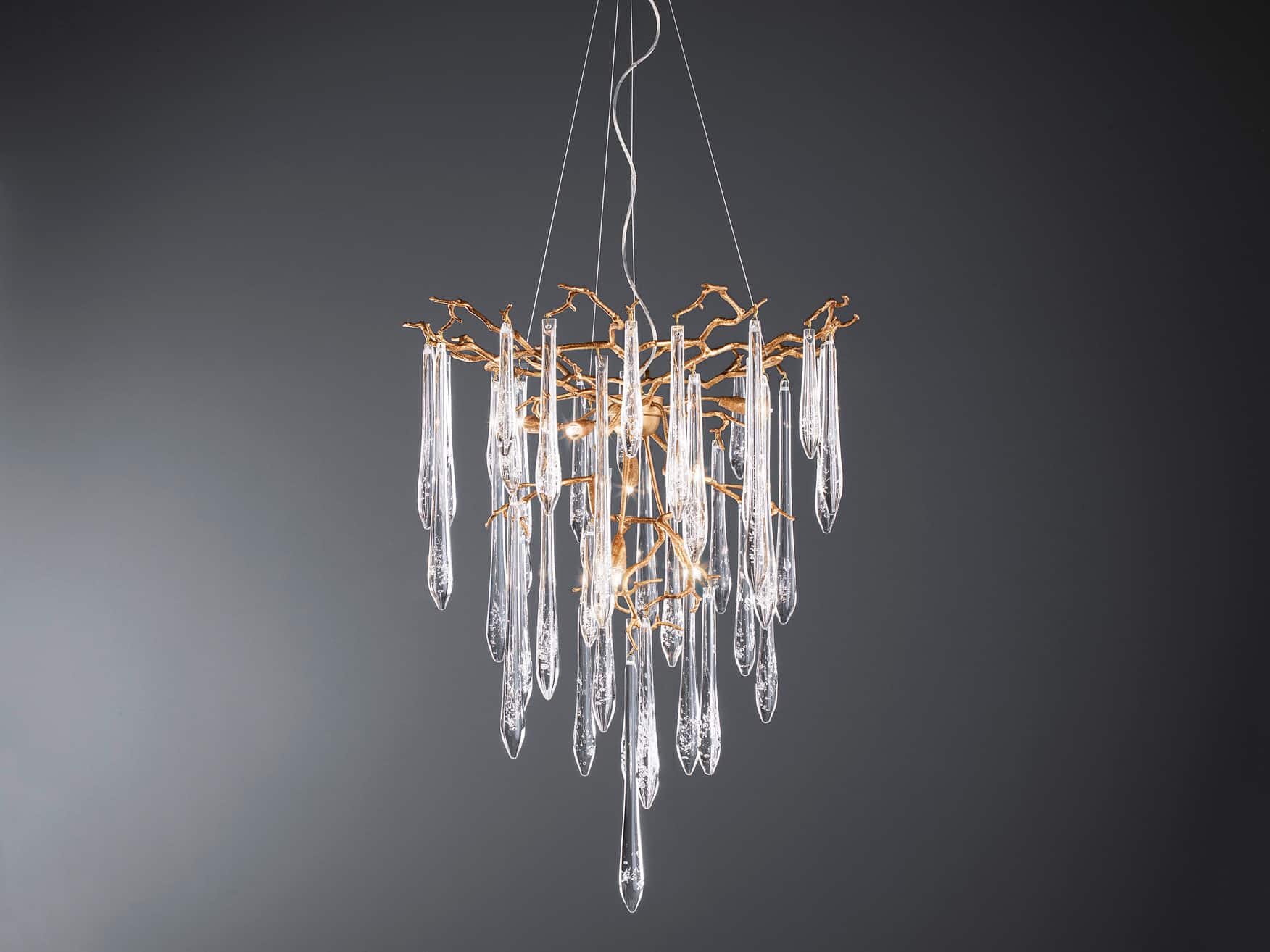 Chiếc đèn tinh tế với từng viên pha lê đều được thổi thủ công dưới sự sáng tạo, khéo léo và tỉ mỉ của người thợ. Đây là một tác phẩm nghệ thuật lấy cảm hứng từ thiên nhiên, độc đáo và tinh xảo, nhưng lại phù hợp với mọi không gian sống từ phong cách cổ điển đến hiện đại.