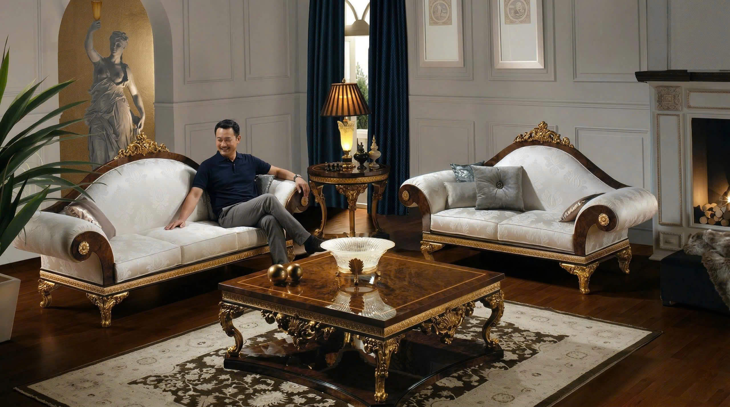 | Chất liệu khung | Gỗ Gõ Đỏ | Gỗ Óc Chó tự nhiên, kết hợp gỗ Nu tự nhiên, Dát Vàng Ý thủ công |